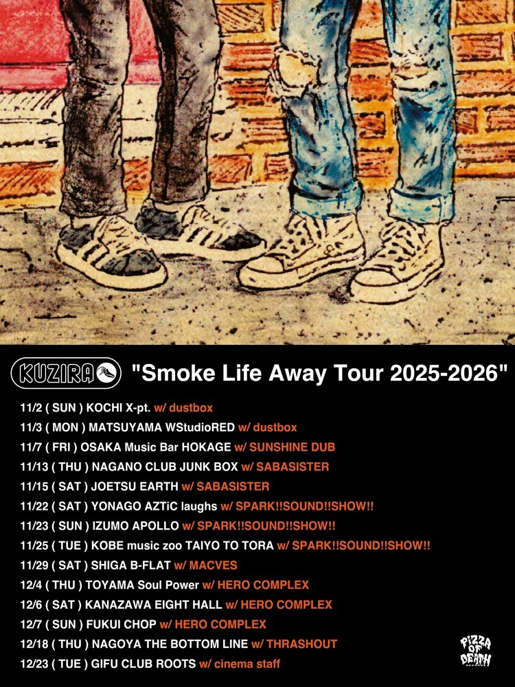 KUZIRA「Smoke Life Away Tour 2025-2026」 スケジュール 2025/11/15(土) 上越EARTH OPEN 17:15 / START 18:00 ◼︎TICKET(発売中) 3,900円 (税込/D代別) チケットぴあ:https://w.pia.jp/t/kuzira-smokelifeaway/ URLをコピーする 報告する