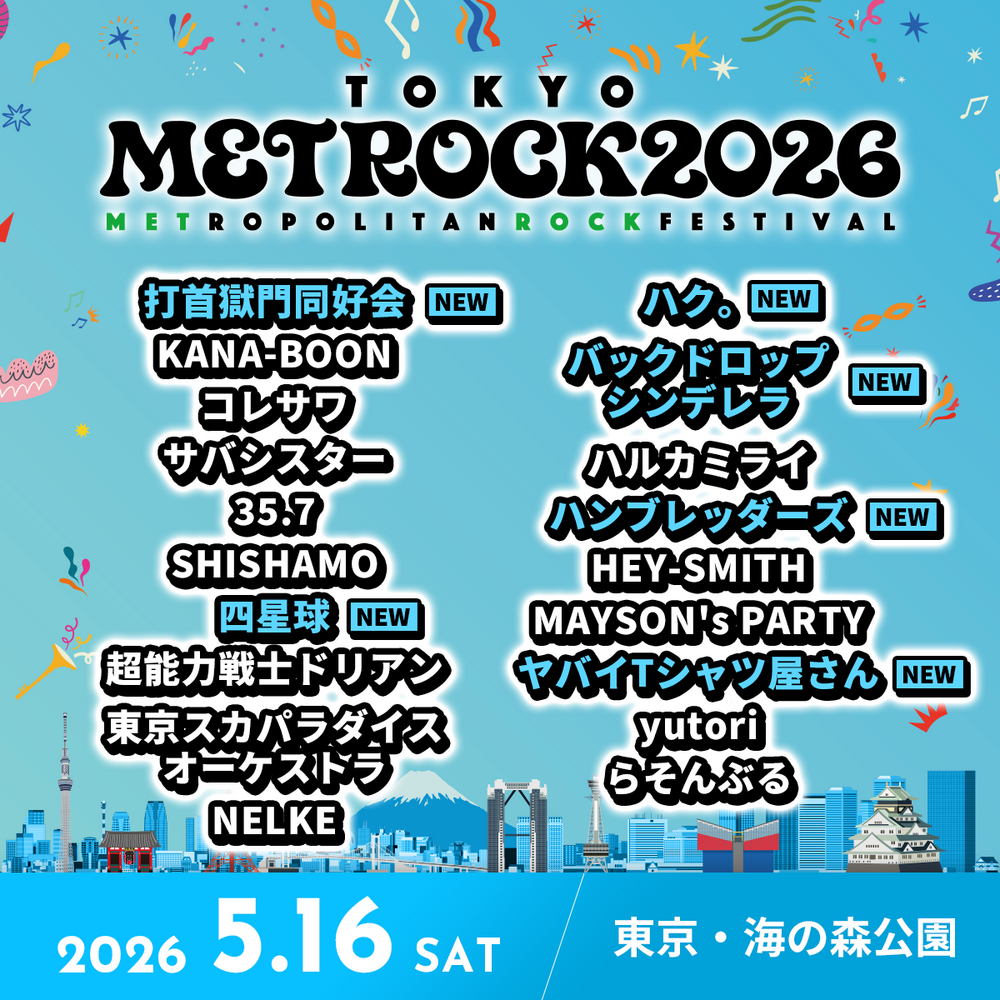 TOKYO METROPOLITAN ROCK FESTIVAL 2026 スケジュール 2026/05/16(土) 東京 海の森公園 詳細はオフィシャルサイトでご確認をお願いします! TOKYO METROPOLITAN ROCK FESTIVAL 2026 URLをコピーする 報告する