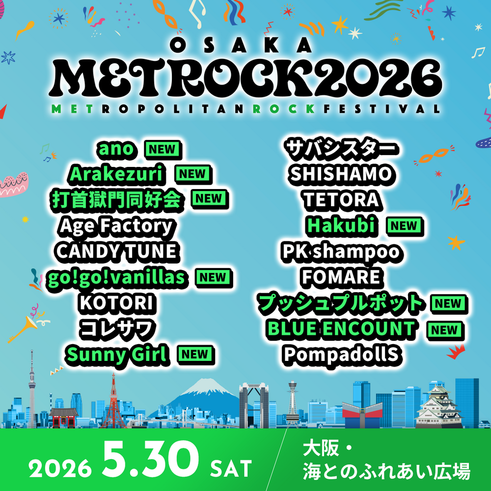 OSAKA METROPOLITAN ROCK FESTIVAL 2026 スケジュール 2026/05/30(土) 大阪 海とのふれあい広場 詳細はオフィシャルサイトでご確認をお願いします! TOKYO METROPOLITAN ROCK FESTIVAL 2026 URLをコピーする 報告する